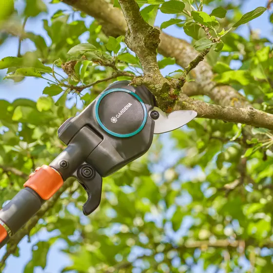 Gardena städ sekatörer skär en tjockare gren av ett träd