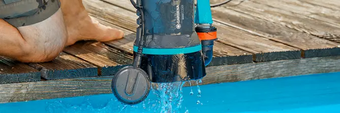 Gardena Dränkbar pump med klart vatten dras ut ur en pool