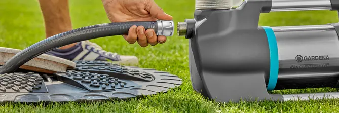En man installerar en Gardena dränkbar tryckpump
