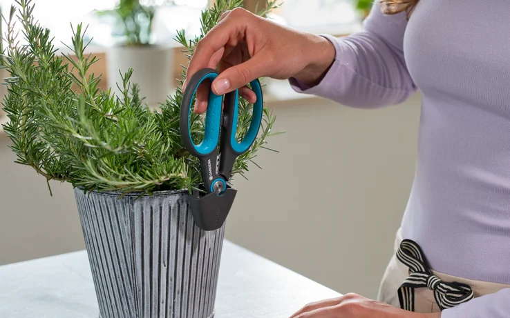 GARDENA HerbCut za zanesljivo rezanje olesenelih zelišč kot so rožmarin, timijan ali žajbelj. V praktičnem kompletu s torbico je HerbCut takoj pri roki. Koničasta rezila iz trpežnega nerjavnega jekla vam omogočajo dolgotrajno natančno rezanje. Med obema ročajema so tri luknje različnih velikosti, ki imajo praktično funkcijo odstranjevanja listov. Skozi njih na primer potegnite steblo rožmarina in z enim gibom odstranite vse lističe. Lističe uporabite neposredno za kuhanje ali pa jih posušite. Zeliščne škarje so enako primerne za desničarje in levičarje in se zaradi ergonomskih ročajev ErgoTec vedno udobno prilegajo vaši roki. Nedrseči ročaji z mehkimi ročaji zagotavljajo trden oprijem ves čas. HerbCut navdušuje s trajnostjo, saj so ročaji in torbica izdelani iz več kot 70 % reciklirane umetne mase. Da bodo škarje takoj dosegljive jih pospravite v etui, ki ga pritrdite na lonček z zelišči. Rezila škarij so primerna za stik z živili in varna za hrano, saj ne oddajajo vonjav ali okusov. Enostaveno čiščenje, saj je izdelek primeren za pomivalni stroj. GARDENA ponuja 25 letno garancijo proizvajalca, po registraciji izdelka na gardena.com/warranty v 3 mesecih od datuma nakupa. Ravnajte previdno. GARDENA Micro-Cutting. Dajte svojemu pridelku spoštovanje, ki si ga zasluži.