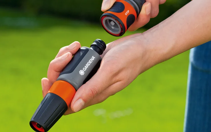 GARDENA komplet z brizgalko vsebuje stop nastavek za cev (art. št. 18213) in GARDENA brizgalko (art. št. 18300). Zahvaljujoč stop nastavku na koncu cevi, se ob razstavitvi spoja voda samodejno ustavi in pri spojitvi znova steče. Prihrani pot do vodovodne pipe npr. pri menjavi brizgalke. Stop nastavek za cev je primeren za 13 mm (1/2") in 15 mm (5/8”) cevi.