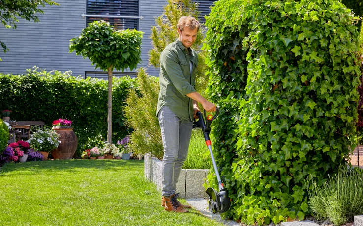Engellerin altını da mı düzeltmek istiyorsunuz? O halde düzeltici başlığının açısını değiştirin. Veya dikey kenarlar boyunca kesmek mi istiyorsunuz? Düğmeye basın ve döner başlığı kenar konumuna çevirin. Çimenliğin hemen kenarındaki çiçek tarhında yetişen bitkiler için endişelenmeyin. Çekip çıkarılabilir ve sökülebilir bitki koruyucu, çiçeklerinizin ve çalılarınızın korunmasını sağlar.