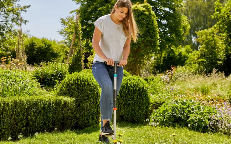 Запатентовані леза прополювача дуже вузькі та близько розташовані, що робить цю конструкцію придатною для висмикування кульбаб з газону, не залишаючи великих отворів. Працювати з практичним видалячем бур'янів GARDENA приємно та безпечно для вашої спини, навіть протягом тривалого часу.