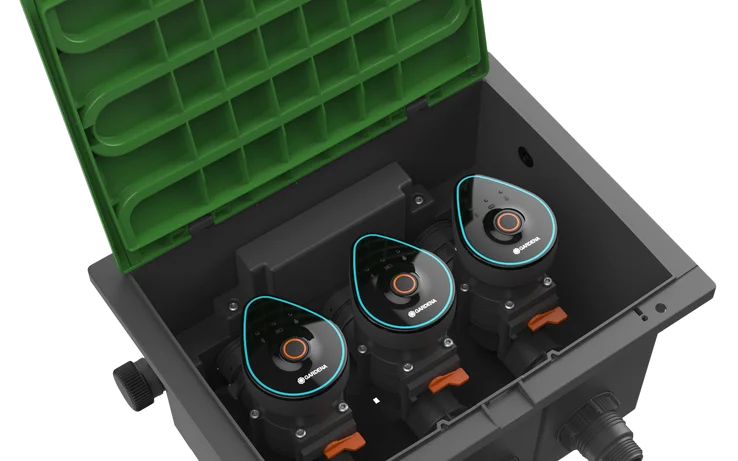 Набір GARDENA для керування системою поливу складається із трьох клапанів для поливу 9 В Bluetooth® та коробки клапанів Valve Box V 3. Клапани для поливу 9 В можна легко програмувати з відстані до 10 м від пристрою за допомогою додатку GARDENA Bluetooth App® на смартфоні або планшеті. Для кожного клапана можливо налаштувати шість різних графіків поливу, у яких можна встановити час, тривалість та дні тижня. Світлодіодні індикатори надають інформацію про з’єднання Bluetooth®, стан батареї та процес поливу. Функція «Water Now» (Полив зараз): якщо потрібно негайно почати полив, його можна активувати вручну без зміни налаштувань. Можна використовувати разом із датчиком вологості ґрунту GARDENA.