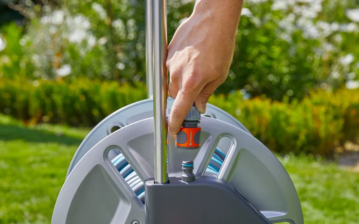 Візок для шланга GARDENA CleverRoll M Metal є особливо міцним і надійним. Він може витримувати найбільші навантаження під час виконання робіт у саду, є зручним у використанні та заощаджує місце для зберігання шланга. Шланг зручно намотується на котушку за допомогою ергономічного колінчатого важеля, виготовленого з міцного пластику. Опора, що складається, запобігає перекиданню візка. Спеціальна форма та помітно високе розташування коліс також підвищують стійкість візка. Для заощадження місця під час зберігання опора та колінчастий важіль складаються, а ручка опускається.