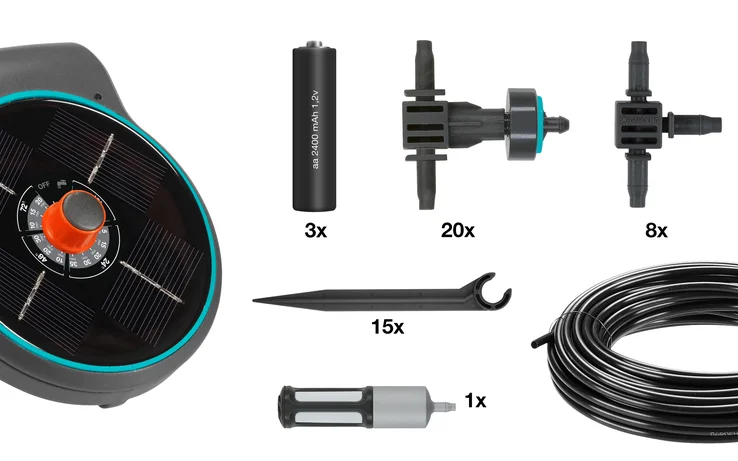 Доглядайте за рослинами, коли вас там немає. З GARDENA AquaBloom ваші рослини які живуть на балконі знаходяться в хороших руках - протягом усього сезону. AquaBloom піклується про ваші рослини навіть у часи, коли вас немає поруч. Корисна система не вимагає ні водопровідного крану, ні джерела живлення у вашому саду чи терасі. Завдяки додатковій емкості для води ви будете готові до роботи. Набір AquaBloom - це повна готова до використання система зрошення, що складається з 3-в-1- Основний блок: Він поєднує насос для подачі води, блок управління для визначення режиму поливу та сонячної панелі, яка живить включені акумуляторні батареї. 14 попередньо визначених програм поливу дозволяють вам контролювати полив до 20 рослини за допомогою крапельниць, що компенсують тиск. Кожна крапельниця може доставити до 300 мл Не забудьте скористатися дуже зручним і гнучким розміщенням AquaBloom. Виберіть сонячне місце для блоку управління: повісьте його на вазон, поставте його на стіл або закріпіть на стіні. Установка AquaBloom проста та без інструментів!