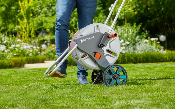 GARDENA CleverRoll M Metal особливо міцний і стійкий, здатний витримувати навіть найбільші навантаження в саду. Він дозволяє компактно зберігати садовий шланг і при цьому - він зручний у використанні. Шланг можна надійно змотувати за допомогою ергономічної пластикової ручки з м'якими пластиковими компонентами. Завдяки складаній ніжці він не перекидається. Його особлива форма та помітно високе розташування коліс також підтримують стійкість візка для шланга. Для компактного зберігання ніжка просто складається, велика ручка опускається, а маленька ручка - складається.