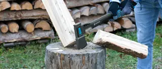 A Gardena axe splitting a log on a tree stump, with stacked logs in the background.