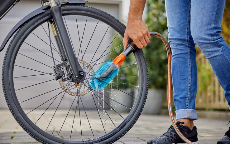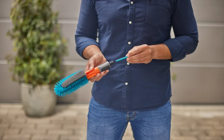 Cleaning bicycles, trailers and prams is often awkward and time-consuming, gathering up a range of tools such as various sponges, brushes, cleaning agents and buckets of water. With the GARDENA Cleansystem Bike Brush, this is now a thing of the past: connected to the garden hose with just one “click”, you can get started with cleaning, and your bike, bicycle trailer or pram will be shining in no time.