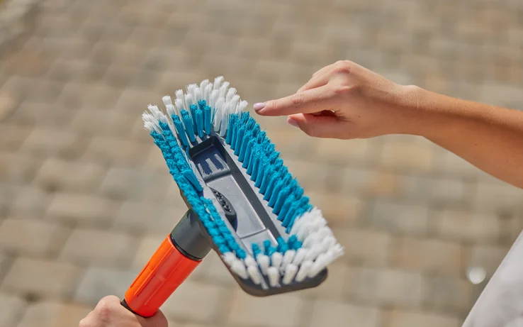 The handled brush was developed with hard bristles to quickly and easily remove stubborn dirt from hard surfaces. As a result, it can effortlessly clean uneven floor surfaces, joints and recesses in paving stones that are difficult for conventional brushes to access. The special flat jet nozzle and scraper edge for loosening stubborn dirt ensure thorough, all-round cleaning.