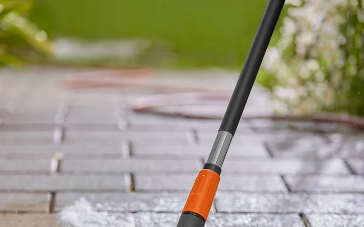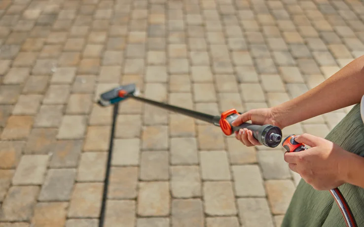 The GARDENA Cleansystem cleaning set with handle is suitable for cleaning larger, hard surfaces such as stone patios and paths.