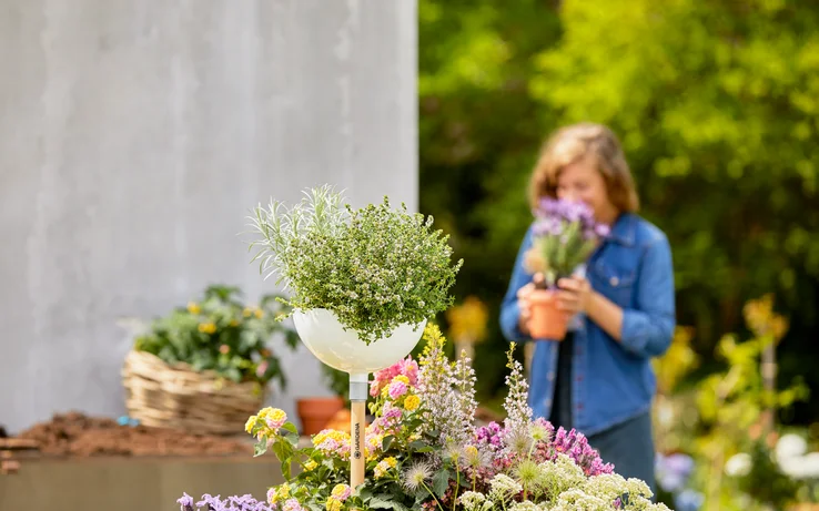 Garden passion in every season can be found with the GARDENA ClickUp! FlowerBowl. Lift your plants to the next level and let your flowers grow in the sky. Using the combination of the ClickUp! Handle and the FlowerBowl, planting is the focal point of your garden and is an absolute eye-catcher. Planted herbs or strawberries can be easily picked from the bush without bending down. The height protects your small bed from unwanted pests such as snails or mice. The FlowerBowl has a diameter of 25 cm (just under 10 inches) and is therefore ideal for medium-sized plants. To attach the elegant FlowerBowl to the stylish ClickUp! Handle, just click it on. Thanks to the One-Click connection, attaching and detaching the decorative elements is easy. What's more, the connection is extremely stable and remains wobble-free: your planting cannot slip or fall down. The ClickUp! FlowerBowl is made of high-quality acrylic glass (PMMA material). The material not only looks good, but is also extremely robust and weatherproof. This garden decoration can even stand cold days and is not damaged by frost. When watering, a water drain at the bottom of the bowl protects your plants from getting waterlogged. There is a drip edge below the bowl so that the ClickUp! Handle is not damaged by the run-off water, the draining water can drip directly onto the ground without running along the handle. Give your garden its own style in a simple way with the GARDENA ClickUp! FlowerBowl. GARDENA gives a five-year warranty on the FlowerBowl. The all-season lifestyle system for a garden that gives you flowers in the sky.