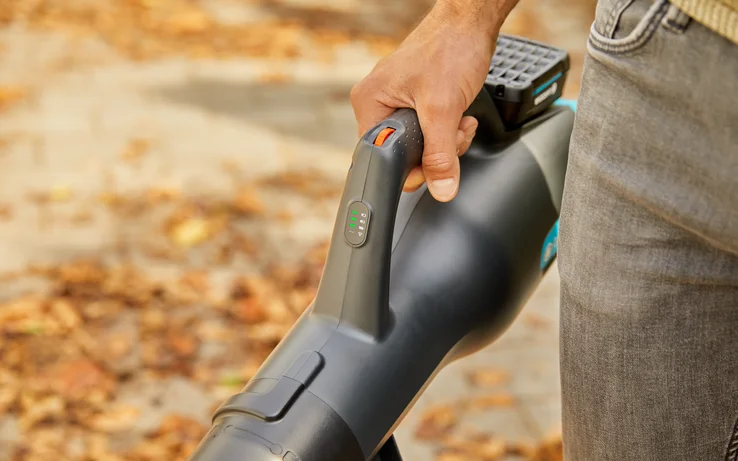 Depending on use and garden application, the speed of the blower can be adjusted individually. Thanks to its low weight of just 1.8 kg, working with the blower is extremely comfortable and easy, even over longer periods. The blower is also so well balanced, there is no fatigue in the wrists and arms. This is further enhanced by the excellent ergonomics of the product. A clearly visible LED display on the device shows the current battery charge level.